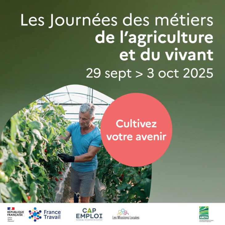 En organisant les Journées des métiers de l’agriculture et du vivant du 29 septembre au 3 octobre, France Travail Bretagne, l’ANEFA et leurs partenaires souhaitent renforcer l’attractivité du secteur, faire connaître ses métiers et ses formations, faciliter les recrutements des entreprises et susciter des vocations. Ils sont associés à la Région Bretagne, la Chambre d’agriculture, OCAPIAT, DRAAF, DREETS, CHEOPS Cap Emploi, ETA, CUMA, l'UNEP, les services de remplacements, les familles de l'enseignement agricoles, la FNSEA Bretagne.Cette semaine, place aux métiers de l’agriculture et du vivant en Bretagne. Près de 80 événements organisés par France Travail Bretagne et nos partenaires vous ouvrent leurs portes.